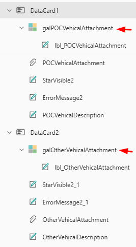 Add gallery in those 2 Custom Datacards for displaying attachments. Items Property for galPOCVehicalAttachment is colAttchments and galOtherVehicalAttachment is colAttchments_1.